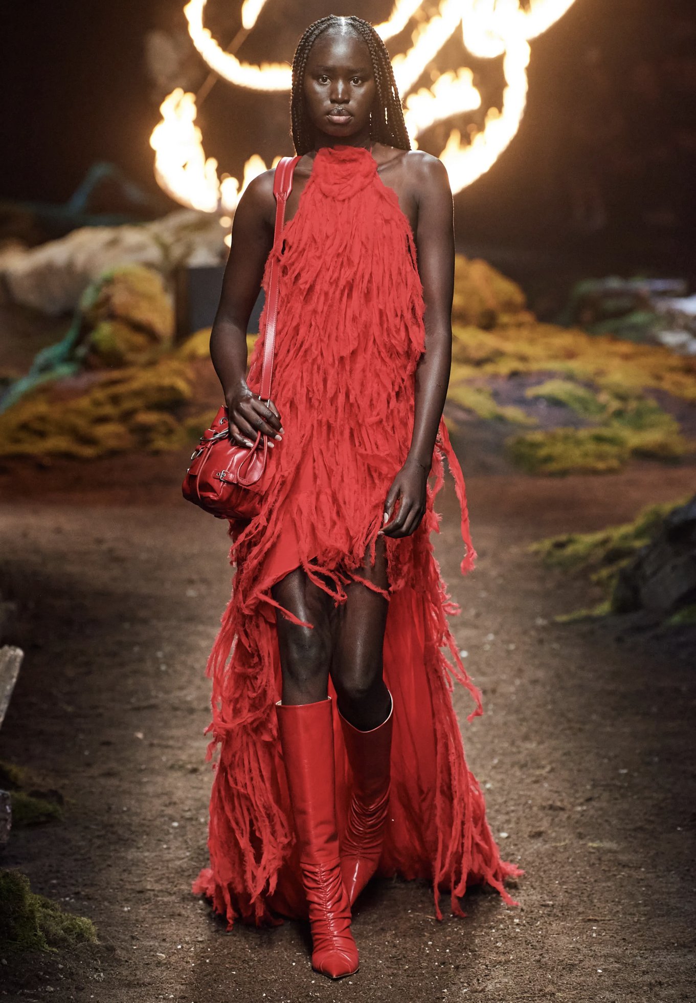 Model Adit Priscilla followed the burning theme to a point as she looked on fire in a red, frayed, back-bearing gown.