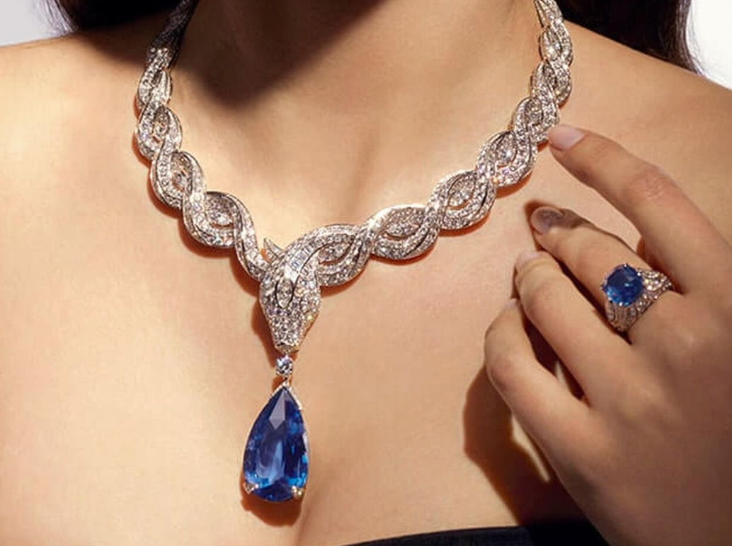 The Serpenti Ocean Treasure necklace is another mesmerizing piece of the collection. The Serpenti, an iconic figure for Bulgari, has an intertwining body that wraps around the neck. The snake appears to be guarding the drop shaped Sri Lankan sapphire that is the focal point.