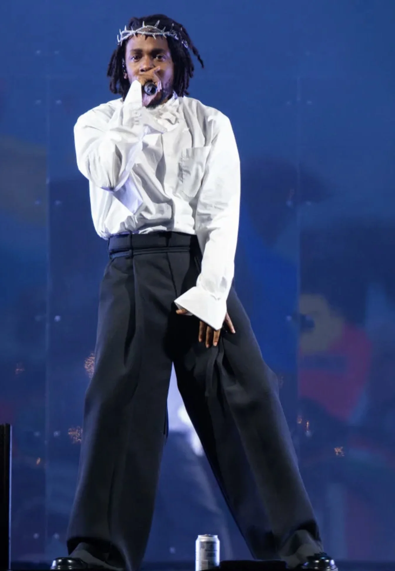 This past June 26 the rapper stepped out wearing the titanium diamond-encrusted crown for his performance at the Glastonbury Festival. Kendrick wore a simple oversized custom made Louis Vuitton white button down and black trousers. Allowing for the crown to have the spotlight.