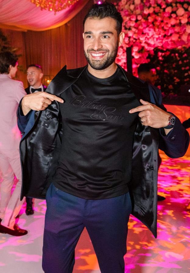 For the reception, Asghari put on a navy suit worn over an embroidered black t-shirt that said, “Britney & Sam”.