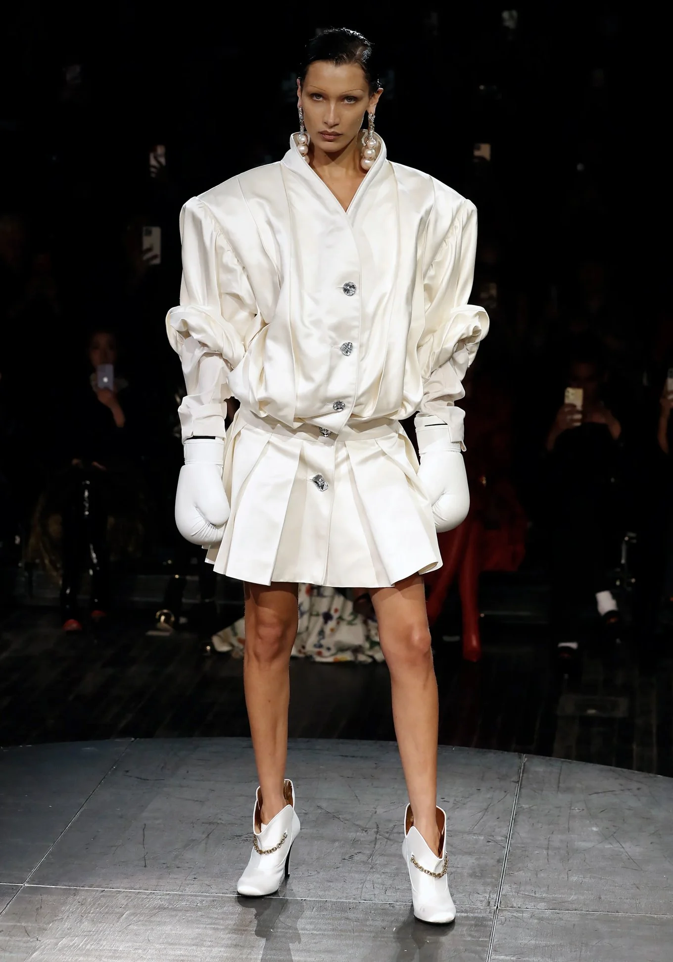 Closing the catwalk came model of the moment; Bella Hadid. Wearing a pair of ivory boxing gloves with an oversized suit and shorts, a costume fitting for fashion’s champion model of the season.