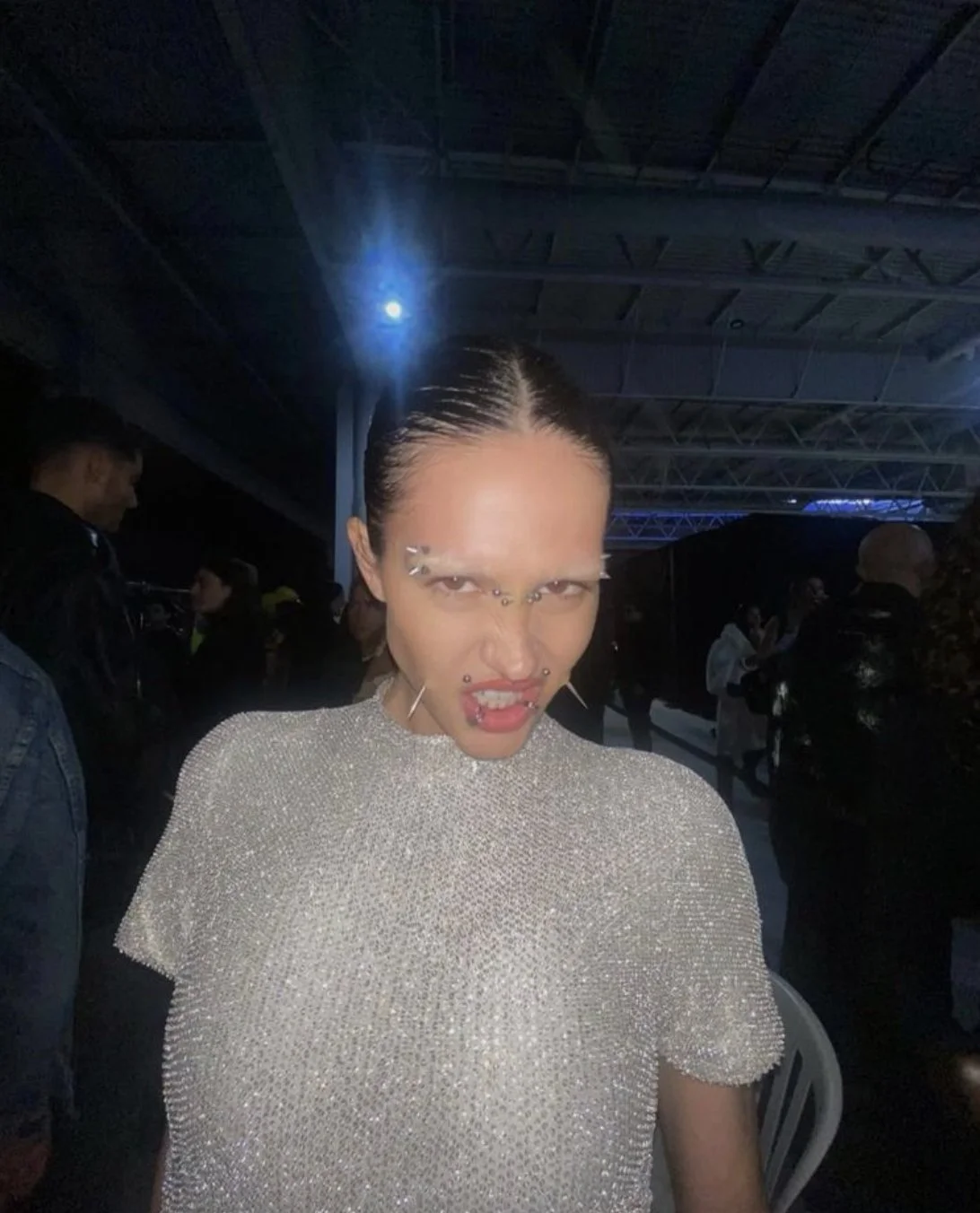 An anti-establishment collection rounded up by the impressive and real-like use of prosthetics and piercings. Every model was adorned with eyebrow piercings, lip perforations, studs dotting their cheeks and spikes coming out of foreheads. A rebellious, punk, defiant look created by drag queen and special effect master Alexis Stone. Embracing a dark side to the usual soft and light approach for spring. We could easily be seeing the return of emo aesthetics next season as Prada, Dior, Puma and Balenciaga dipped their toes in it.