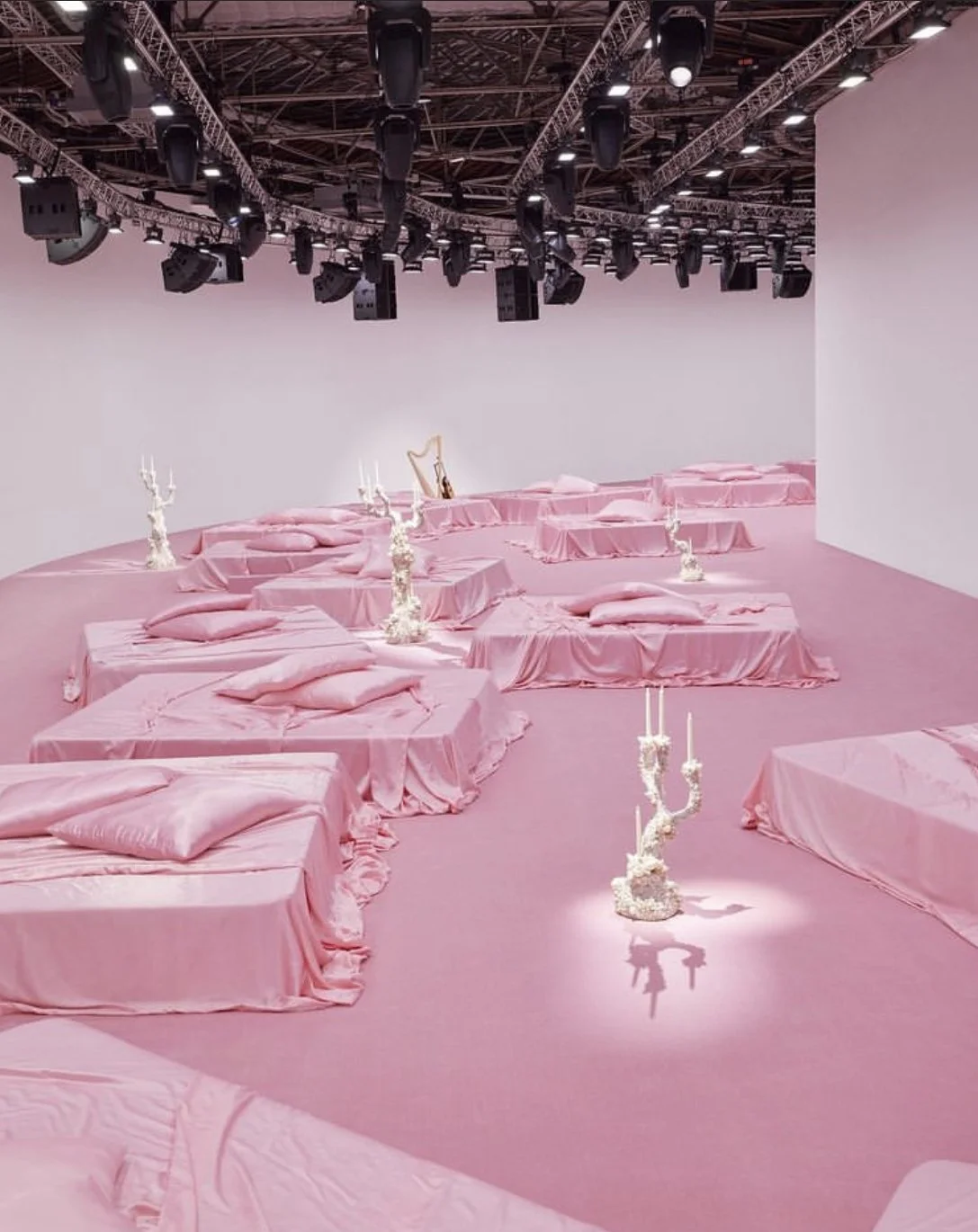 For its SS23 collection Acne studios presented a softer, more delicate collection. It was sort of a Nordic pink cotton candy dream as the brand's signature hue decorated the carpets of the venue.