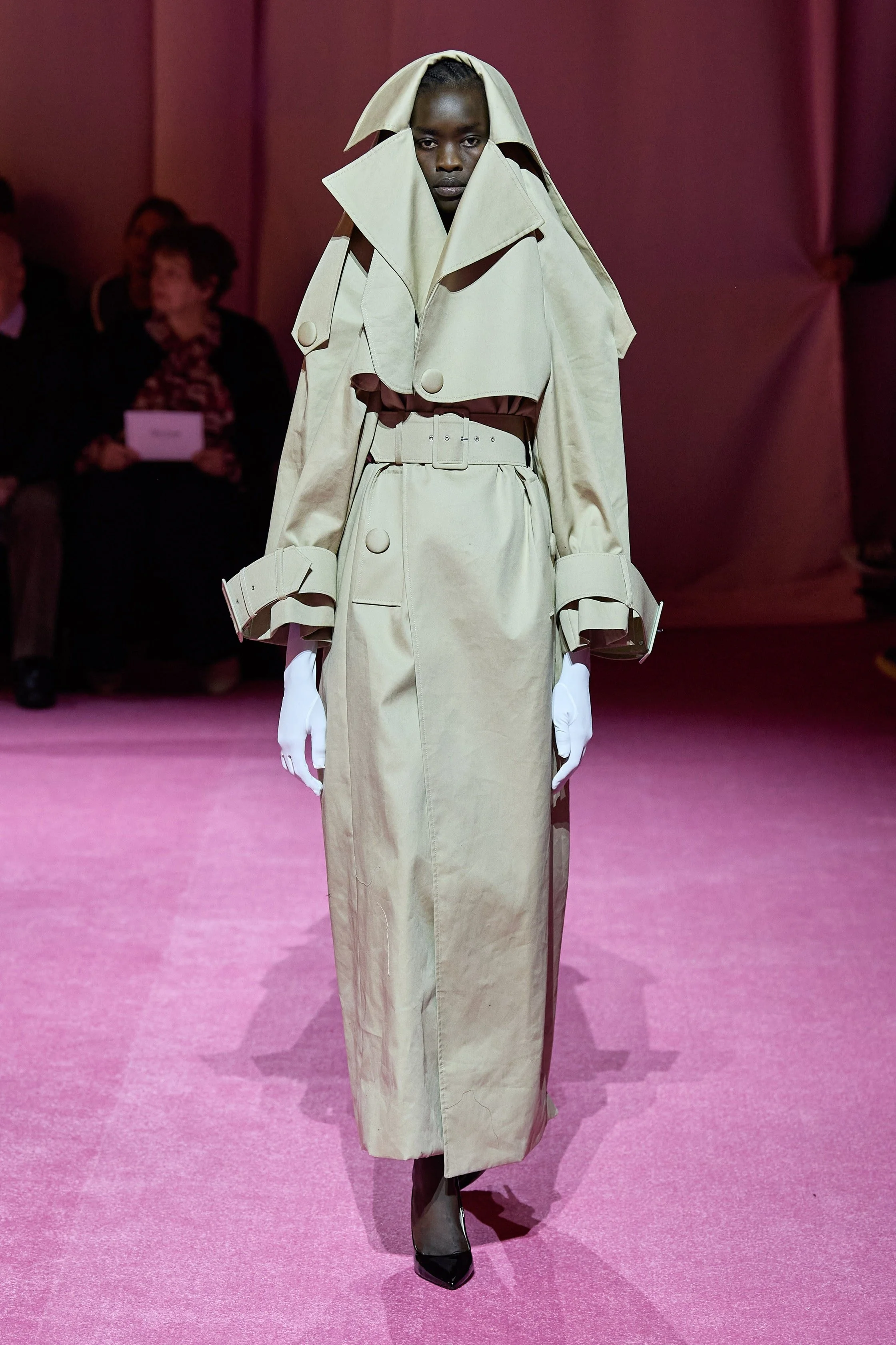 In the city of London, a trench coat is a staple for all those rainy days. In this look, Richard Quinn put his own unique twist on the classic London trench coat. The simple tan color allows for the interesting silhouette to be the dominant feature of this design. Quinn used his signature collar-turned-hood style to make a statement with an otherwise simple design.